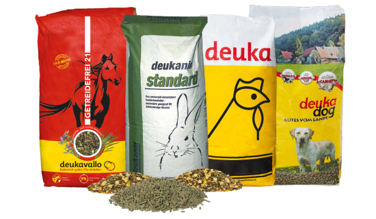 - Wir haben Futtermittel für Geflügel, zum Beispiel für Hühner, Wachteln oder Gänse, sowie Systemfutter für Kaninchen (deukanin), Hunde (deukadog) und auch Pferdefutter (deukavallo Getreidefrei 21) im Sortiment.